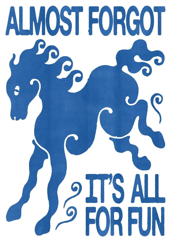 “Almost Forgot, It’s All for Fun” is a whimsical, text-driven artwork that fuses bold typography with playful imagery. A stylized blue horse, its body dissolving into swirling, cloud-like forms, leaps across the print with dreamlike motion. The accompanying words remind viewers of life’s simplest truth: not to take it all too seriously.