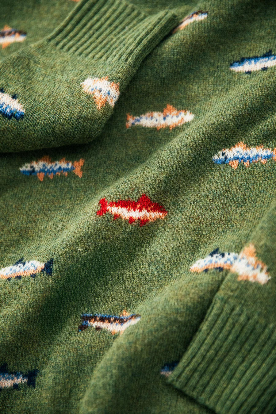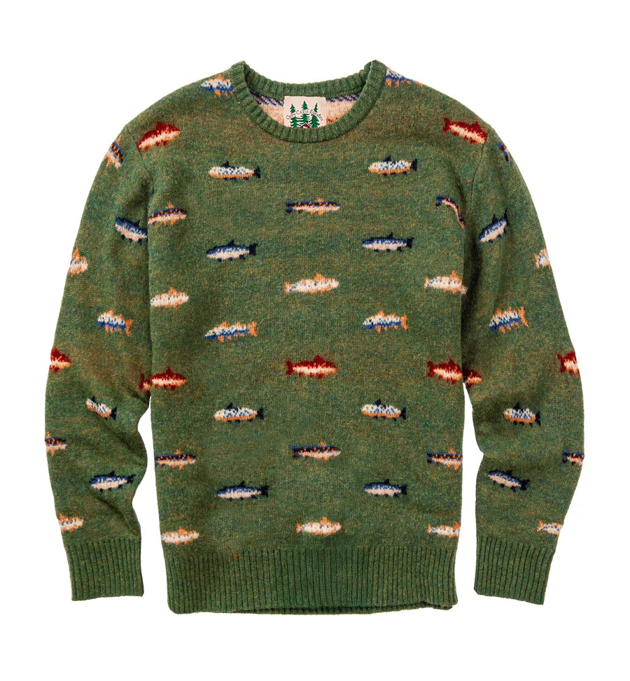 tribute to quiet mornings by the water, the Brook Trout Sweater celebrates the timeless charm of New England’s angling tradition.Knit from soft, mid-weight yarn and patterned with colorful brook trout, it brings a touch of sporting lodge style to crisp autumn days. Finished with ribbed cuffs and hem for a comfortable fit, it’s the perfect layer for casting a line at dawn or relaxing fireside after the day’s catch.