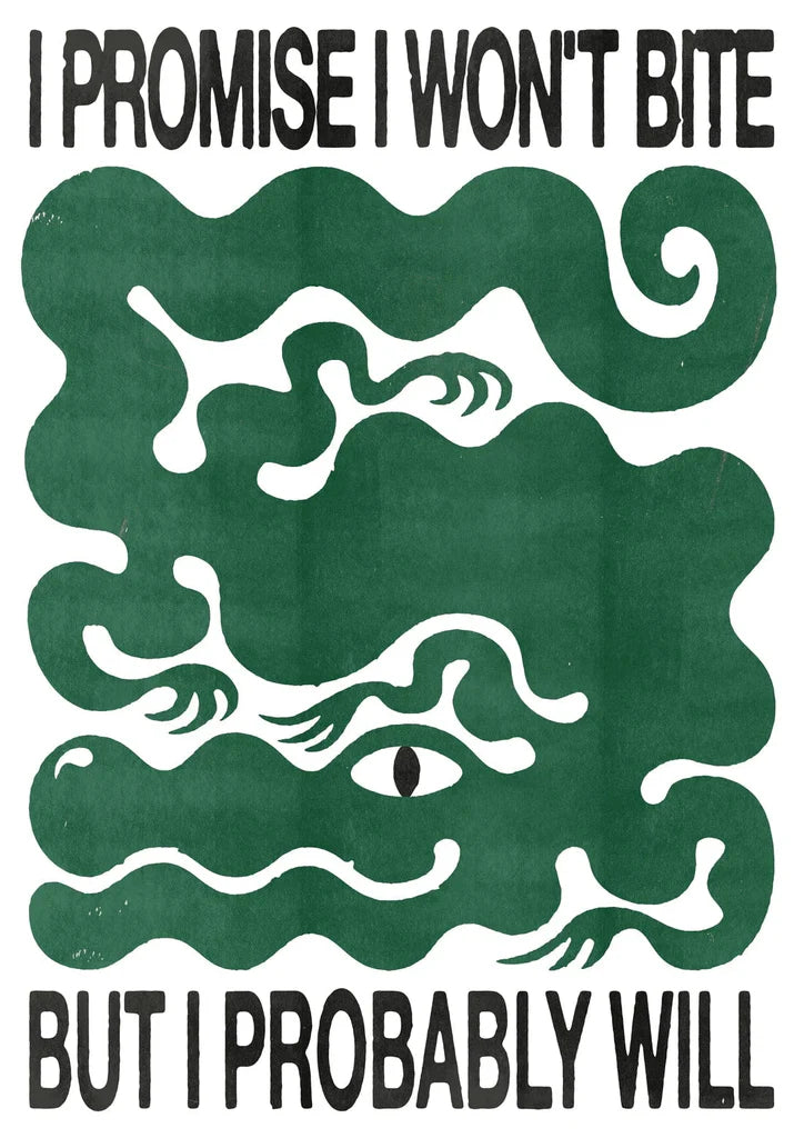 Playful yet unsettling, “I Promise I Won’t Bite (But I Probably Will)” is a bold, graphic artwork that balances humor with menace. A deep green, serpentine creature twists across the composition, its eye peering out with mischievous intent. Above and below, the stark text declares a contradictory message — part reassurance, part threat.