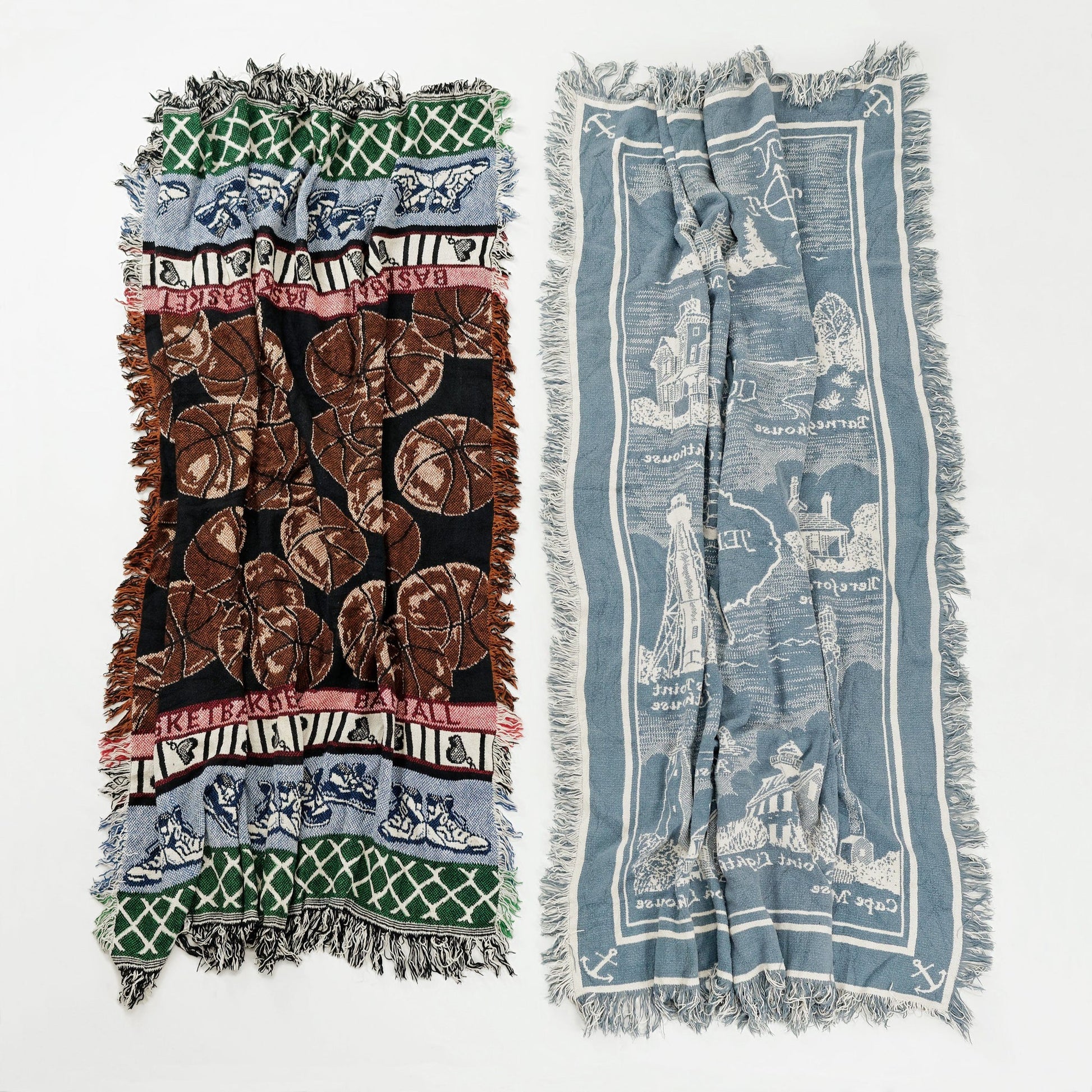 Wrap up in our Preloved Woven Tapestry Blankets. Made in a jacquard weave with fun graphics, fringed edges, and a great weight to the material, these throw blankets are well suited for fort building, Netflix binges, and even DIY sewing projects!