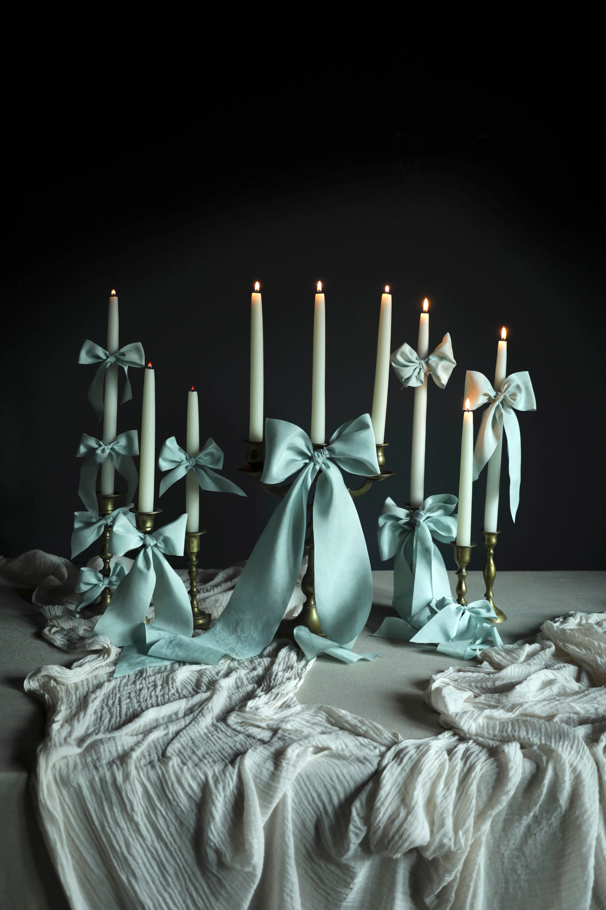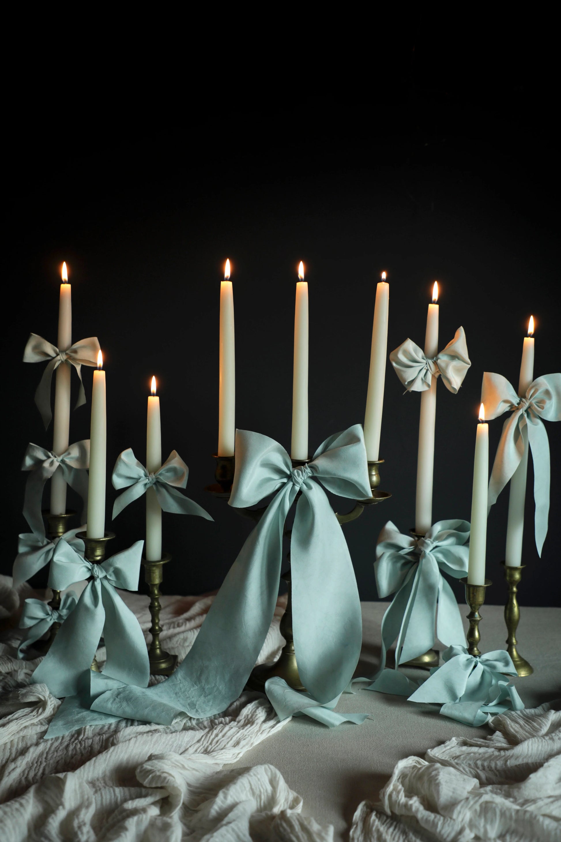 The Wonderland Blue Silk Ribbon Candle Set transforms a simple tablescape into an atmosphere of elegance and storybook charm. Ivory taper candles glow warmly in antique brass holders, each tied with a luxurious blue silk bow. The flowing ribbons catch light and shadow, softening the formality of the candles with a whimsical flourish.